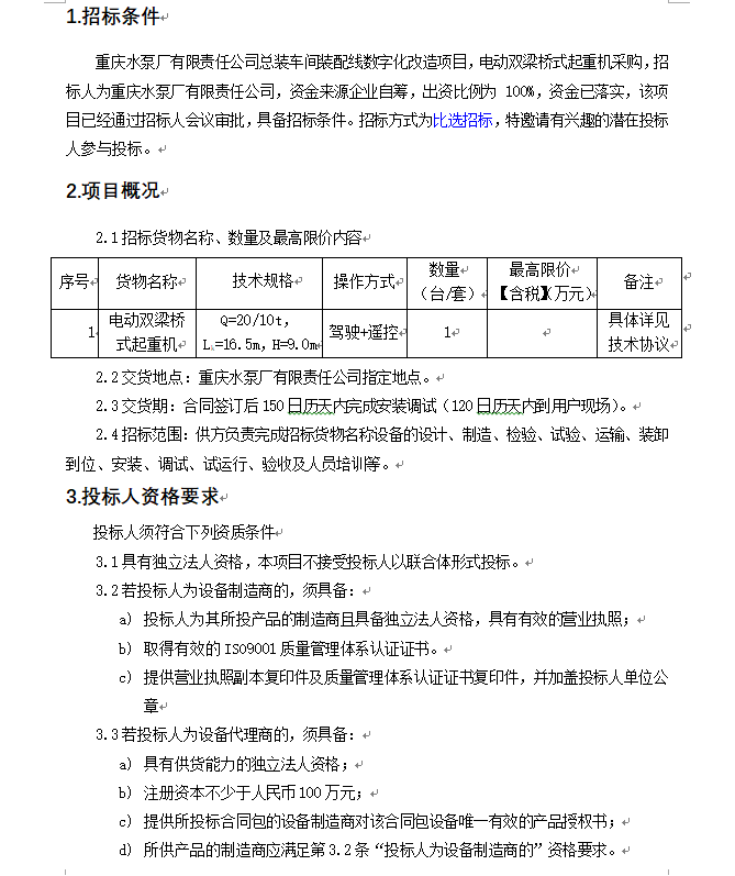 總裝車間裝配線數(shù)字化改造項(xiàng)目 電動雙梁橋式起重機(jī) 招標(biāo)公告