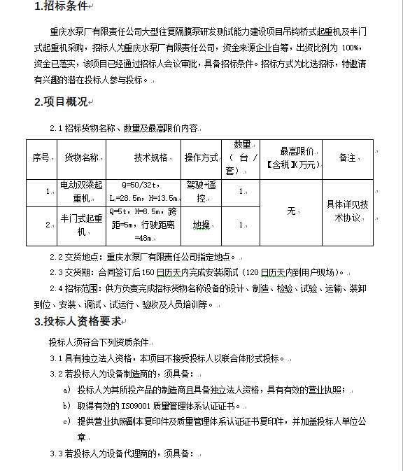 大型往復(fù)隔膜泵研發(fā)測試能力建設(shè)項(xiàng)目 吊鉤橋式起重機(jī)及半門式起重機(jī) 招標(biāo)公告