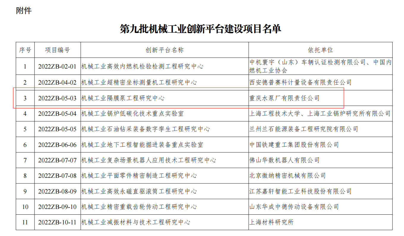 重泵公司再獲批國家級創(chuàng)新平臺 ----機(jī)械工業(yè)隔膜泵工程研究中心