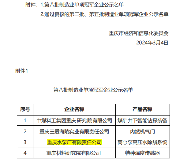 近日,工業(yè)和信息化部公布了第八批制造業(yè)單項冠軍企業(yè)名單,重泵公司成功入選,成為本批重慶入選的4家企業(yè)之一,實現(xiàn)了重慶機電集團在國家級制造業(yè)單項冠軍企業(yè)中“零突破”。這是繼公司獲得國家技術創(chuàng)新示范企業(yè)、國家專精特新“小巨人”企業(yè)等工業(yè)和信息化領域的榮譽后,再次獲得又一項國家級榮譽。